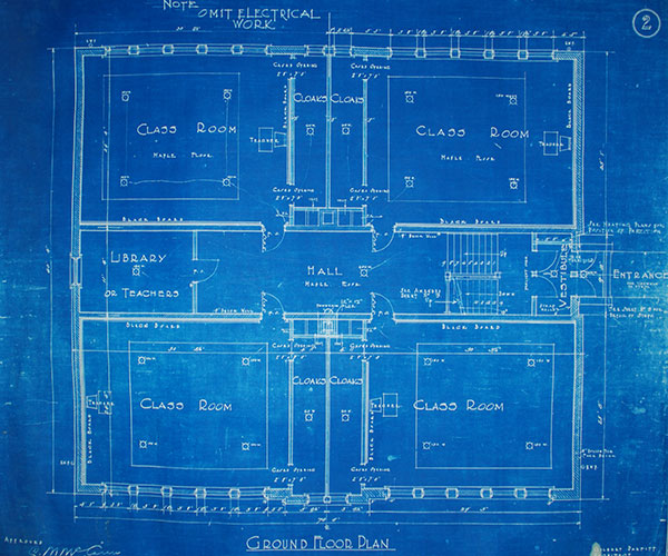 Blueprint of ground floor plan for Woodhaven School (1922) by Gilbert Parfitt