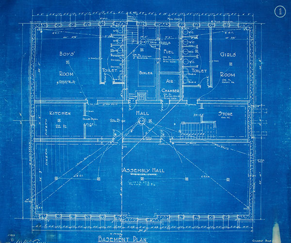 Blueprint of basement floor plan for Woodhaven School (1922) by Gilbert Parfitt