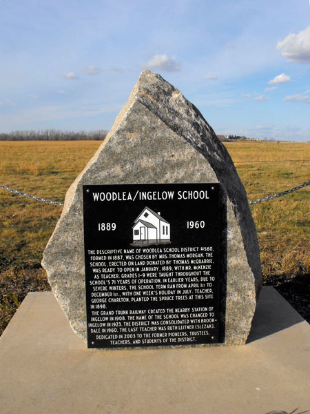 The Grand Trunk Railway created the nearby station of Ingelow in 1908. Woodlea School was renamed Ingelow School in 1923. It operated until January 1960 when it was consolidated with Brookdale Consolidated School No. 1299. A monument was dedicated in 2003 to the former pioneers, school trustees, teachers, and students of the district.