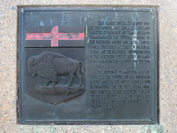 A plaque on a monument in the Rural Municipality of Rosser was unveiled in August 1980 by Donald W. Orchard, at that time Minister of Highways and Transportation in the government of Sterling Lyon. It commemorates the official opening of the Northern Woods and Water Route, running from Dawson Creek, British Columbia to this site near Winnipeg. The route provides access to natural scenic and recreational opportunities in the northern forest areas of Manitoba, Saskatchewan, Alberta, and British Columbia. The monument is slightly off Highway 6 on an overgrown site that looks like it has not been maintained in years.
