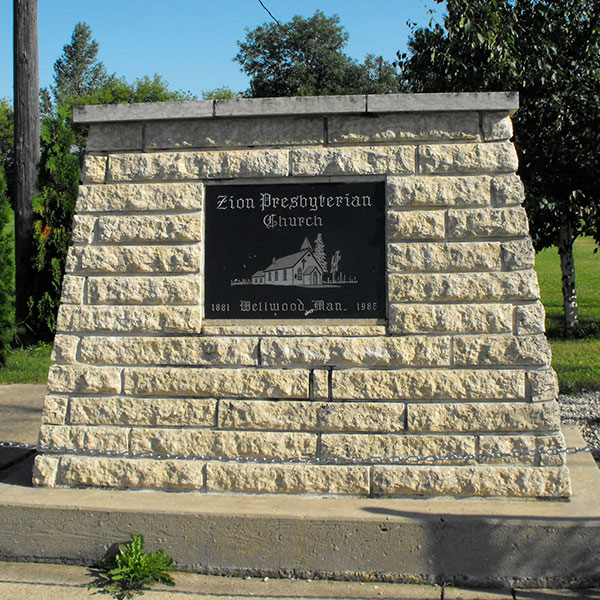 A monument at Wellwood, in the Municipality of North Cypress-Langford, commemorates Zion Presbyterian Church which operated at this site from 1881 to 1985.