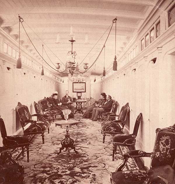 View inside the passenger lounge of the steamboat City of Winnipeg on the Red River, by Duffin & Co., circa 1881.
