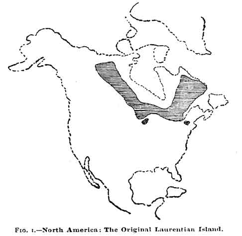 Below the drift or soil, with which our former lecture dealt, there are limestone and sandstone beds; but below these again there is the hard Laurentian formation that we must describe. All of us know that when we go east of Winnipeg on the Canadian Pacific Railway, at a distance of forty or fifty miles from the city the prairie is left behind, and a rocky region is entered upon. This rocky region, which we call Laurentian, or in some places Huronian, appears as the surface rock first in R. 7. Tp. 9, some thirty miles east of Winnipeg. This is the farthest extent of the original island stretching from Labrador, north of the great skins, for more than 1,600 miles, and reaching to western limit at the point named. This formation runs northward along the east shore of Lake Winnipeg and then to the Arctic Sea See (Fig. 1).