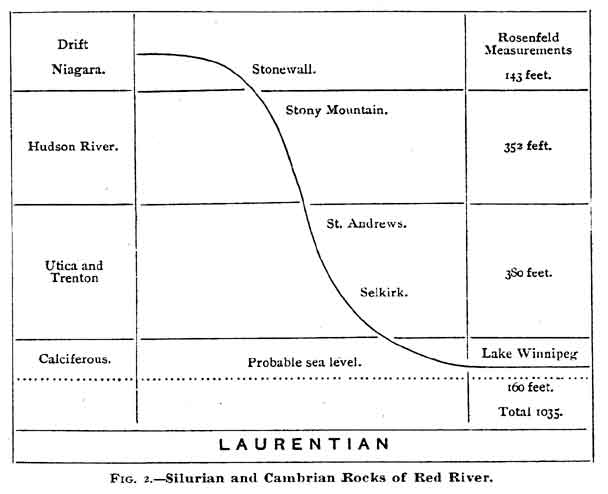 Perhaps the most useful operation we have had for obtaining an accurate knowledge of our Red River valley rocks was the boring conducted by the Canadian Pacific railway in 1885 at Rosenfeld Station, 60 miles southwest of Winnipeg. By the use of a percussion drill, after boring a little more than a thousand feet, the Laurentian foundation was reached. The logbook kept by the drilling party has enabled the geologists to make out a complete section of the limestone and sandstone rocks, such as we have from no other source. It is true that these rocks at this point are thicker than had been supposed, and there are grounds for thinking that as we come northward to Winnipeg they will not be so thick. The revelations made by the drill quite fit in with the geological observations made of the Stony Mountain, Red River, and Lake Winnipeg exposures. It is now possible to make out a general view of the rock formations from the boundary line to the basin of Lake Winnipeg. Figure 2 is an attempt at this, showing the rocks of the various ages, and their localities as observed in this valley and basin. It is based chiefly on Dr. G. M. Dawson's article (Transactions Royal society, 1886).