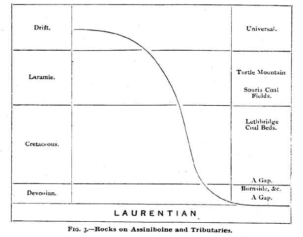In Fig. 3 it will be noticed, that at two different stages a gap is marked This is the case in the lower instance at Burnside. Here the borers found, after penetrating 103 feet of drift beds of Devonian rock 42 feet thick, lying directly on the hard Laurentian (or Huronian). It does not of course follow that everywhere in this region the Silurian rock should be missing as in the case before us. The Laurentian rock struck in boring at Burnside is nearly as high above the sea as the top of the drift at Winnipeg, so that there was evidently a great ridge of Laurentian rock, at this point standing up as an island or cliff in the old Silurian ocean. Another gap will be noticed between the Devonian and Cretaceous. Here should have been the Carboniferous rocks, containing the coal measures, and the deposits of the New red sandstone period. No doubt the explanation of their absence is, that during those ages when the Nova Scotia and Pennsylvania great coil beds were being formed in the swamps, this region was an island standing above the ocean. It will be seen also that in the Upper Cretaceous rocks occur the deposits of coal, from which are sold in Winnipeg large quantities of Galt Mine coal, while in the Laramie just above these are found the coal beds of the Souris River, which promise to give us cheaper coal of fair quality.