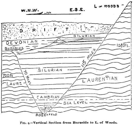 These underground revelations which we have been enabled to make on the first prairie level, may be embodied in a diagram (Fig. 4) showing the relation of the Lake of the Woods, the trough of the Red River, and the Burnside rocks. This figure indicates, taking a section of the country running in direction E.S.E. from Burnside, through the Rosenfeld rocks, and then to the south end of the Lake of the Woods, an enormous Laurentian trough. It shows also that while the Laurentian at Lake of the Woods is 1,060 feet above the level of the sea, this fundamental bed descends in the course of 115 miles to a depth of 265 feet below the sea level at Rosenfeld, or in all 1,325 feet, and rises again at Burnside, 70 miles away, to 700 feet above the sea. The probabilities, as has been said, are, that at Winnipeg the trough is not so deep. It seems highly probable that between the city and Lake Winnipeg there runs from east to west below the Silurian and Cambrian a ridge of Laurentian (or Huronian) rock connecting Burnside and the old Laurentian island, lying to the northeast of us. It may be explained that in the northern half of the Lake of the Woods there occur the metalliferous rocks now called Huronian. We have preferred to use the well known term Laurentian rather than Archaean, which some are now employing to include both Laurentian and Huronian.