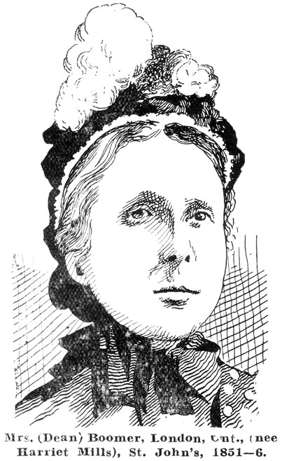 In 1856 Miss Mills was married to Francis Johnson, recorder of Rupert's Land, afterwards Judge Johnson, and for a time governor of Assiniboia, who, later still, was created Sir Francis Johnson, and a judge of the supreme court of Canada. It may have been noticed that Lady Johnson died recently in Montreal, having survived her husband several years. Soon after her daughter's marriage Mrs. Mills left Red river. She afterwards took charge of the Helmuth Ladies' college, in London, Ont. Miss Harriet Mills, though not Canadian born, yet from long residence, ranks among Canadian women authors. After leaving Red river she married a Mr. Roche, whom she accompanied to South Africa, and her book, "On Trek in the Transvaal," was published in London, Eng., in 1876. It is now out of print, but since the outbreak of the South African war, extracts from it have been re-published by the Canadian press. Mrs. Roche's second husband was Dean Boomer, of London, Ont. Mrs. Boomer is a prominent member of the National Council of Women of Canada and her racy humor and sound common sense give her a telling power in its meetings. She is also a member of the school board of London, Ontario, in which city she makes her home.