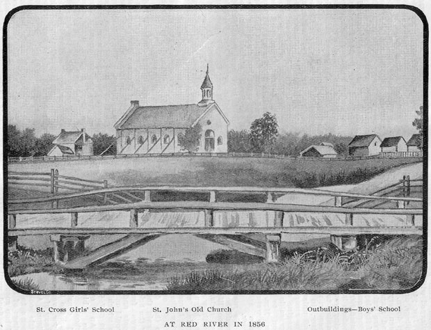 An event occurred early in the history of Mrs. Mills' school which must have caused considerable excitement. This was the flood of 1852, when the Red river overflowed its banks and drove many of the settlers from their homes. Bishop Anderson, who has written a little book called "Notes on the Flood," seems to have occupied one of the wings of St. John's Boys' school. The bishop speaks of the gradual rising of the flood until his library was endangered and it had to be removed into St. Cross, as being a new building and more likely to withstand the pressure of the water. The young ladies cheerfully assisted in the transfer but very soon Mrs. Mills and her youthful charges had to be removed to a place of safety.