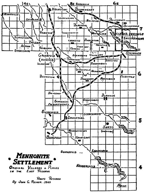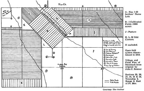 Special acknowledgement is hereby made to Mr. John C. Reimer for permission to use his village and field plan of Steinbach and his map of the Mennonite settlement showing the original sites of the Mennonite villages in the East Reserve.