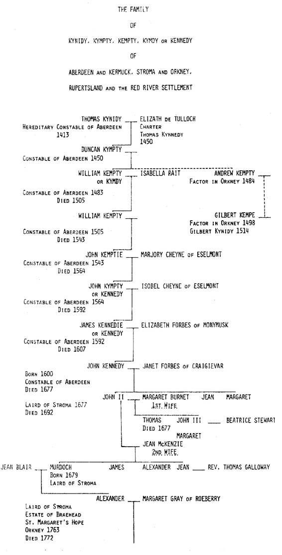 Whether Thomas Kynidy, or one of his antecedents, was a member of the Carrick families is not known. It has been suggested that he was. The cross-crosslet of the Lords of Carrick was also used on the shields of the Kennedys of Kermuck as the descendants of Thomas Kynidy came to be known. It has also been suggested, that since Robert I, the Bruce, had granted lands and titles in Aberdeenshire to followers who had assisted him in his struggle for the Crown of Scotland, there was a possibility that a Carrick Kennedy might have participated in such rewards. Alexander Scrymgeour, who bore the Royal Banner in the Army of Scotland was appointed Hereditary Constable of Dundee in 1298 by Sir William Wallace, which office was held by Scrymgeour's heirs down to 1746, when it was abolished, along with that of Aberdeen and other hereditary jurisdictions in Scotland by Act of Parliament in 1746. In view of Robert the Bruce's Carrick connection, the office might have been bestowed by the Crown for distinguished service. Thus, the title might have been held continuously for at least 350 years by a family known since 1564 and, probably earlier, by the name of Kennedy. In any case there is documented proof that this family held that honor for 250 years from the time of Thomas Kynidy in 1413. In a Charter in his wife's favour in 1450 the Constable of Aberdeen's name appears as Thomas Kynnedy. In the same year a new Constable of Aberdeen was named as Duncan Kympty. In 1483 in the records of the courthouse of Aberdeen there is mention of William Kympty, Constable, appointing a deputy to act in his place. The same William Kympty is referred in the Charters of Ellen in 1495 as being in possession of the lands of Carnmuk and others in the parish of Ellon. Again, in the records of the Court of Aberdeen the death of William Kympty, or Kymdy is recorded in 1505. His son William Kempty is recorded as Constable of Aberdeen in 1505. This second William held the position for thirty-eight years and died in 1543. During the time of these two Williams, we find an Andrew Kempty as a Factor in Orkney in 1484 and subsequently a Gilbert Kempe also as a Factor in Orkney in 1498. The same Gilbert is recorded in 1514 with a surname spelled Kynidy. Whether they were a branch of the Aberdeen Constables is not known. In the Charters of Ellon, to return to those Kennedys of Aberdeen that we are interested in, we find that in 1543 John Kemptie or Kympty and his spouse, Marjory Cheyne of Eselmont were invested with the lands of Carnmuk and others, in succession to his father William Kympty, deceased. John Kympty died in 1564 and his son also named John succeeded him. This John was married to Isobel Cheyne of Eselmont. The Cheynes were a powerful family of the area and held the Barony of Eselmont. In 1591, a royal charter was issued to John Kennedy of Carmuck and James Kennedy, his son, for a half net's fishing on the Dee. The father died in 1592 and James Kennedie, or Kennedy, succeeded to the Hereditary Constableship of Aberdeen. He was married to Elizabeth Forbes, the daughter of the Laird of Monymusk. The Charters of Ellon indicate that James died in 1607. (From the foregoing, it will be noted that the John Kympty who became Constable in 1564 was also referred to as John Kennedy. The spelling of the name seemed to depend upon the scribe).