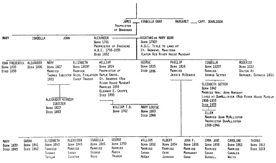 Phillip Kennedy was also born at Cumberland House, in 1816, and schooled in the Orkneys. In 1833, he was listed, along with his mother Aggathas, in the Register of Land Grants of the Hudson's Bay Company, as a recipient of property at St. Andrews. He married Jessie McKenzie and had twelve children, several of whom died in infancy. A review of the names of the people the children married reveals old Hudson Bay and Red River settlement names such as Inkster, Ross and Pruden. Phillip engaged in business and was a member of the Masonic Order. He died in 1873.
