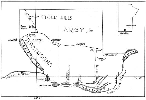 Geographically speaking the area covered in this paper is encompassed in the rural municipalities of Argyle and Strathcona. These municipalities are in the south-central portion of the Province of Manitoba, about fifteen miles north of the international boundary, and at latitude 49.15 north and longitude 99.30 west. The chief topographical features being Rock and Pelican Lakes, which form in a large measure the southern boundary of the area, and the Tiger Hills which cover most of the northern portion from east to west. To the geologist the district has many points of interest. The deep wide valley in which the two lakes lie is part of the old drainage system of the glacial Lake Souris. The Tiger Hills are a terminal moraine of the ice sheet. The area between the two main topographical features is dotted with countless small lakes and water laden depressions. It is today, and likely always has been a hunter's paradise.