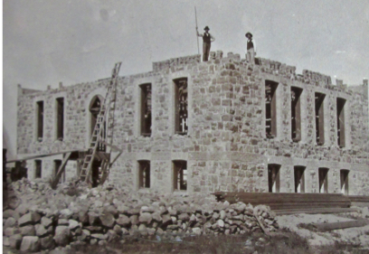 School under construction, a gathering in front of Duncan’s Blacksmith