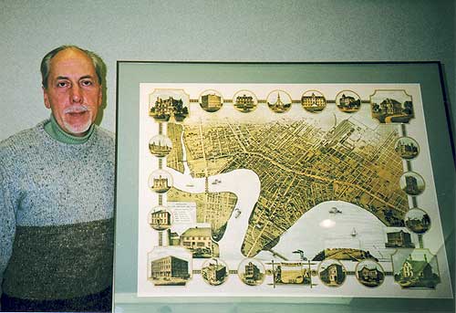 Victor Sawelo showing old Winnipeg map at the Winnipeg Philatelic Society stamp and coin show