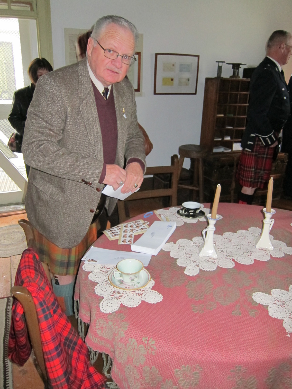 Tim Flook, a member of the St. Andrew's Society of Winnipeg, purchased copies of the Selkirk stamp and mailed several letters from Ross House Museum during the event.