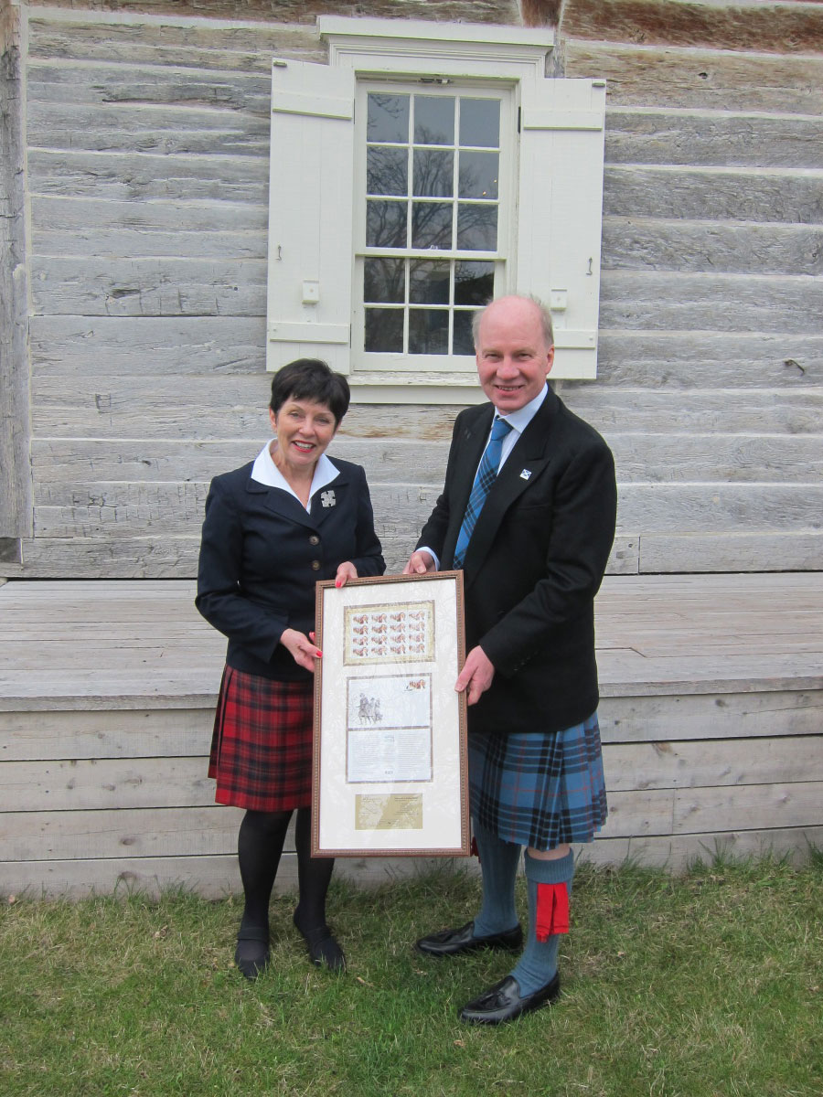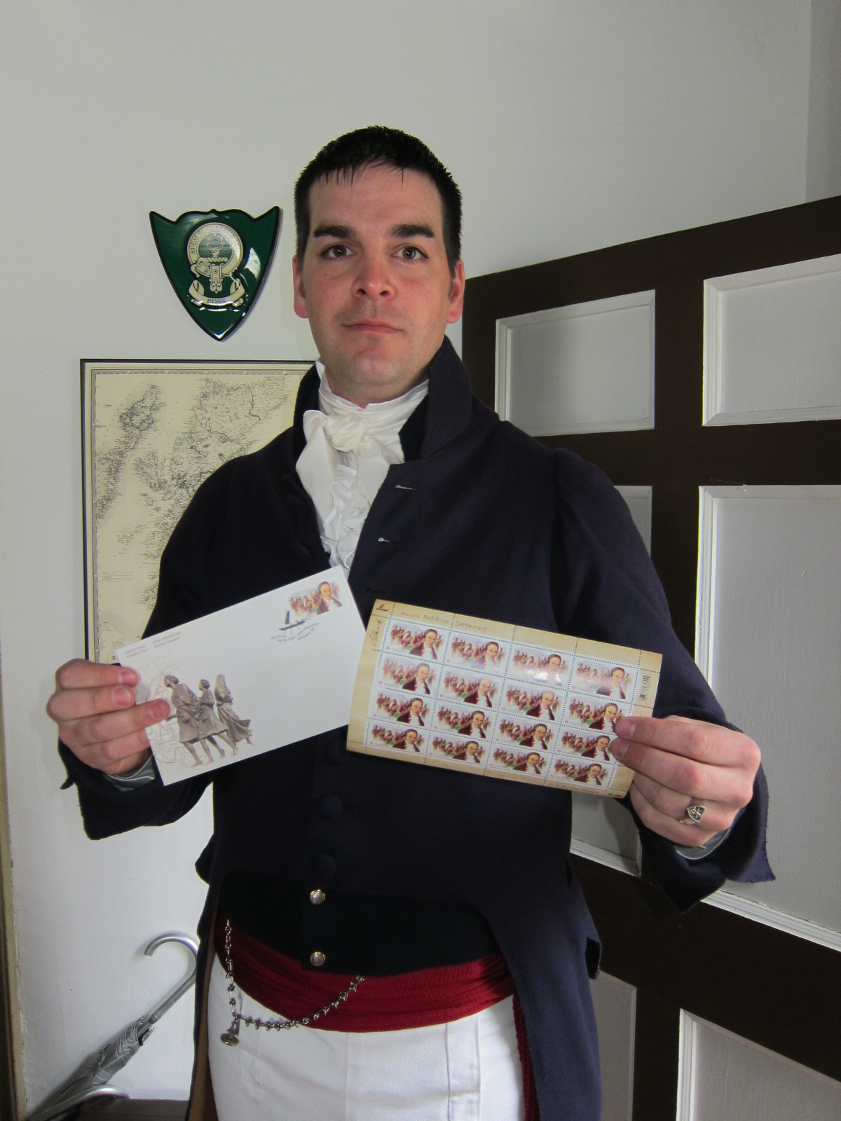 Lord Selkirk, portrayed by Chris Black, an active member of the Manitoba Living History Society, displayed a set of the special Lord Selkirk commemorative stamp.