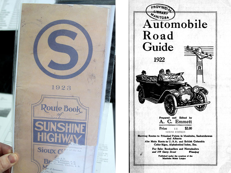 A: In the 1920s, the Sunshine Highway organization and the Manitoba Motor League published guides (photos below) showing the route of the Sunshine Highway. We are using those guides to reconstruct the route on today's roads.