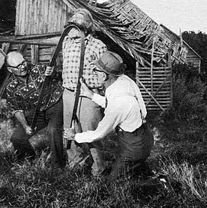 But Mike’s ineffectiveness as a farmer was not totally of his own doing. He, like so many other young men of that early prairie era, became a victim of circumstance. His first love lay in entertaining, and the tour with the Barnum & Bailey circus seemed to answer this love; but when he received a telegram from his father telling him to return home for the harvest, Mike had no recourse but to comply, as any dutiful son must. The people of the circus could not believe that he would give up the chance of a world tour for a town “not even on the map.” When his father died, Mike, as the eldest son, had to swear an oath to stay with the land. There he remained until his death. He half-heartedly cared for the farm he never wanted, taking his greatest satisfaction in restoring the old Budasshelters made of wood, mud, and straw where the original Ukrainian immigrants to the Olha area lived ... and often died.