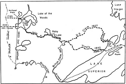 Simplied map showing 1827-42 dispute over boundary west of Lake Superior, and three stages of boundary-making beyond the northwest angle of the Lake of the Woods.