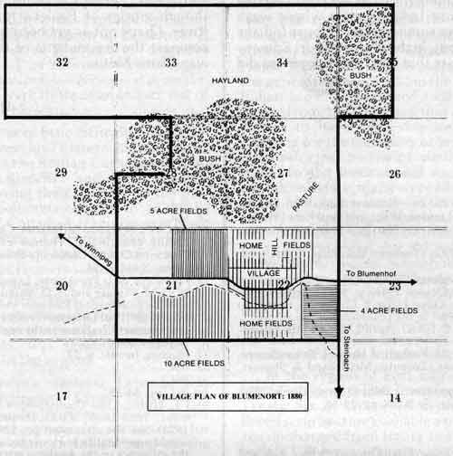 18. See enclosed village district map of Blumenort, 1884, based on information from John B. Toews Map, in E. K. Francis Papers, Provincial Archives of Manitoba; Jacob W. Friesen map in the possession of John C. Reimer, Steinbach, Manitoba; Abram L. Plett map in the possession of Rosabel Fast, Edmonton, Alberta; Klaas D. Reimer map in the possession of the Klaas Reimer estate, Belize, Central America.
