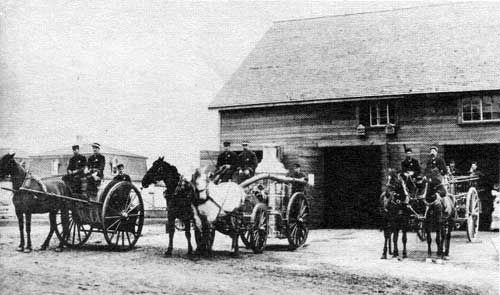 The fire place under the boiler of the steam engine is kept filled with chips of wood saturated with spirits or oil and a long stick with a saturated material is kept at the back of it, which ignites immediately it is applied to the stationary boiler fire, and putting this at once to the steam boiler fire, a big fire there is kindled at once which gets up a high pressure of steam in a minute or two as they gallop along; the movement forward of the steam engine pulls a small chain which detaches the pipes from the stationary boiler and closes the connecting valves in an instant. Each carriage stands with the shafts or pole towards the road and [these] are raised a little to enable the horses to get under them into their places ... The harness is all attached to the carriages and suspended sufficiently high for the horses to get in under it.