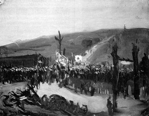 Among those artists who were sent to paint in France during the last years of the war were painters who, in 1920, would join with others to become the Group of Seven. [38] The works they produced are probably indicative of the forces working against Mary Hamilton, although at the time this might not have been obvious. Their paintings, with some notable exceptions, show that their concern was with producing works of art within the Canadian “national” style which they were in the process of creating. Peter Mellen, in his study of the Group of Seven, says that “despite the presence of bloodshed and suffering all around them they showed no inclination to paint it, or to reveal that they were moved by it in any way.” [39] This sounds like an exaggeration but it does appear as if they looked upon this commissioned work as an interruption to their aesthetic preoccupations and not as an emotional experience. Mary Hamilton, on the other hand, was overcome by the disasters of war. Her paintings, while possessing a sombre beauty, are a record of devastation and sadness. They are painted in muted greys, greens and browns, with subject-matter of crosses, trenches and ruined towns; as one writer noted, “there is no heroism, no sign of a victor or a cause.” [40] They are works which seem closer to some English art of the second world war than to that of her fellow Canadian artists of the first. [41] Ironically, it would seem that at the very moment when she began to paint through her emotions instead of her training, a factor which would generally appear to be important in the progress towards “modernity” in Canadian art, she was ignored.
