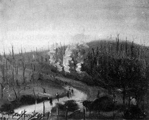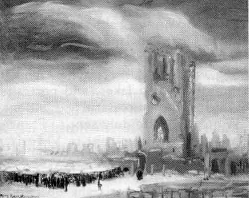 to go alone into the nightmare country of the Somme after Armageddon had passeda country peopled by ghosts, where every rustle of a leaf evokes a shudder and the very pools have been poisoned by the abominable breath of warin order with paint and canvas to produce a lasting vision of the Inferno before kindly Nature had covered up the scars and sores inflicted by the sacrilegious hand of men ... [30]