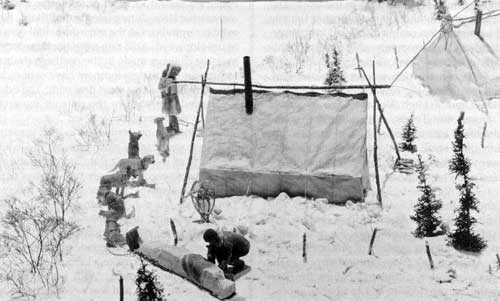 Mini-diorama prepared by Museum artist Betsy Thorsteinson. Diorama depicts camp life and activities of one of the Hudson Bay Railway survey parties during the winter 1908-09.