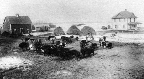 “On the farm of Mr. N. Fehr, Gladstone District. Mr. Fehr is an American settler who has been 13 years in Manitoba. His first home was a small log house, now he has this fine up to date building, good stables and numerous horses and cattle. He is a good farmer but perhaps his specialty is raising hogs.” 1916.