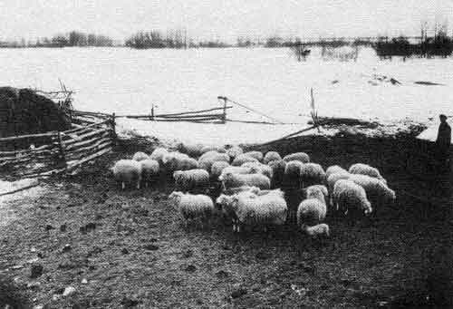 “On the farm of Mr. Geo. McCorriston, (Gladstone) photo taken March 7th, 1917, even the little lamb is quite content although the snow is all about.”
