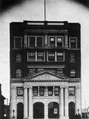 The Union Bank erected substantial offices in Edmonton and Vancouver. From plans by Edmonton architect Roland Lines and Vancouver architects Somerville and Putnam, branches in these two cities opened in 1910 and 1921 respectively. Both buildings utilized contemporary technology. Structural steel was used on the Edmonton building and reinforced concrete on the Vancouver branch. The interiors of the main floor banking halls bore a striking similarity to the hall at the Winnipeg headquarters. But the exteriors of the two buildings were neo-classical. The Edmonton branch more closely resembled the colonnaded neo-classicism of the Canadian Bank of Commerce at Main and Lombard Streets in Winnipeg than it did other Union Banks while the Vancouver office displayed an eclecticism of its own. The Edmonton building did share a few exterior features with corporate headquarters—main floor Romanesque windows and a huge over-hanging cornice. On the Vancouver branch, only the overhanging cornice, a common element in bank design, reflected the corporate style. [20] [See Figure 3.]