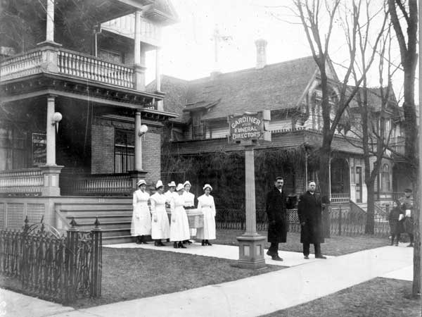 Nurses carry a casket from the Gardiner Funeral Home on Kennedy Street in Winnipeg during the flu epidemic of 1918-1919.