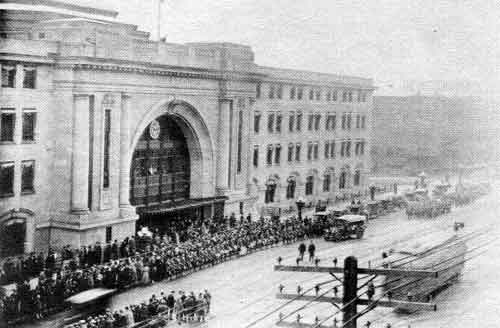 Returning soldiers at Union Station, 1919. Recently returned troops brought the deadly flu virus with them from the battlefields of Europe.