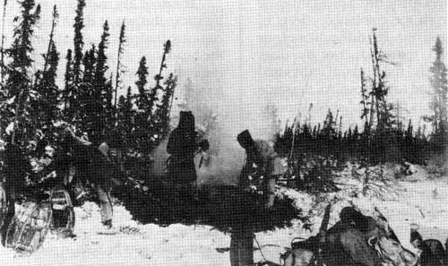 The travelling is almost wholly over the ice and a trail is seldom used unless there is a constant stream of travellers. Only to boil the kettle do they go into the woods and then only at the points. The snow gets driven about so by the winds that it packs and gets into compact size so that a trail is not truly a necessity; only after a fresh and heavy fall, and before any wind, does it present much difficulty to travel.