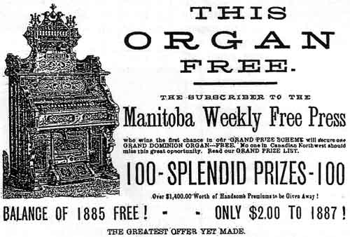There was competition from American sources, however. In the mid-1870s Winnipeg newspapers carried advertisements by a dealer in St. Paul, Minnesota, offering pianos and organs to Manitoba residents, free of duty. The Manitoba Music Store in Winnipeg offered instruments by both American and Canadian makers, as well as tuning, repairs, and instruction. Several reed organs from the Estey Company, Brattleboro, Vermont, were supplied to Manitoba churches through a Winnipeg agent in the 1880s; a one-manual, 19-stop instrument, with ornamental pipes, now electrified, is still in use in St. Andrew’s-on-the-Red Anglican Church.