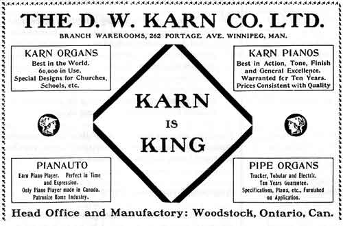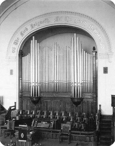 Westminster Church had a reed organ until 1894, when it acquired the discarded Warren pipe organ from Grace Church. Then, five years later, D. W. Karn, Woodstock, Ontario, completed the installation of a two-manual, 24-stop instrument; the opening recital on the handsome instrument was anticipated as “one of the most interesting musical events of the season,” [28] and the organ was compared favourably with the one in Holy Trinity Church. [29]