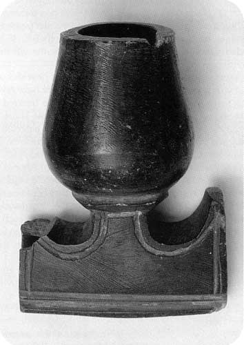 Pipe bowl, black stone, traces of red ocher in incised lines.