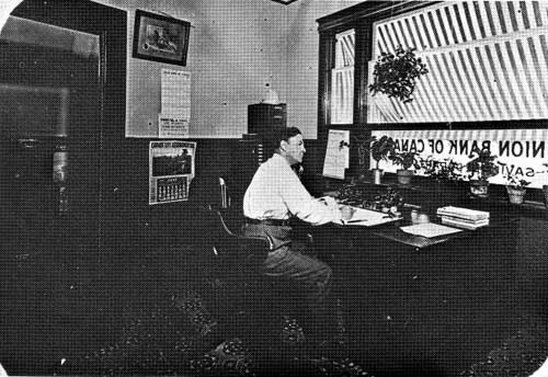 Not all plants were grown in the home. Here the local manager of the Union Bank of Canada sits in front of a sunny plant filled windows.