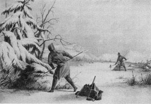 “Spearing Muskrats in Winter, 1853.” An engraving from a watercolour by Seth Eastman showing Indians hunting in the upper Mississippi River area.