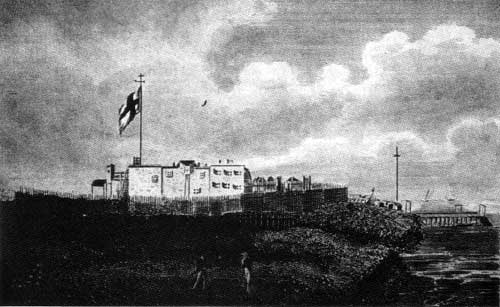 A depiction of York Factory in the 18th century around the time that William Moor and Francis Smith wintered near the post at Ten Shilling Creek.