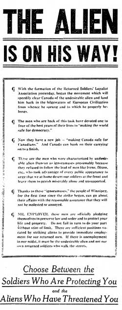 Although the GWVA claimed neutrality, its men made up their own minds and took sides - not all returned men were pro-strike. For the most part, middle-class officers were decidedly anti-strike; one only has to look at Colonel Frederick Thompson, a lawyer who became a spokesperson for an anti-strike veterans group. According to Penner, the rank-and-file soldiers were most likely to remain neutral or pro-strike, but were persuaded by the red-scare propaganda to become anti-strike. [32] These men emphasised loyalty to ‘King and Country’ and believed that the Strike undermined these things. They saw that the government must make changes, but were willing to go about making reforms through the ‘proper channels.’ They too were angered by inflation and the high cost of living but their main concern was that of the alien. They believed that the alien was the cause of all their problems from unemployment to the spread of socialism/communism throughout Canada. And the only solution was for the deportation of the aliens and the confiscation of their possessions, the proceeds of which would be used to pay for veterans pensions.
