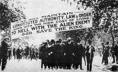 In many ways Winnipeg was a city at war with itself. The city was divided socially, economically, geographically and ethnically. While labour and business battled for power, there was also the ethnic problem. Winnipeg was divided into people of British origin and the more recent immigrants, mostly from Eastern Europe. These immigrants inhabited the area north of the CPR rail tracks, which provided not only a physical division between rich and poor but also an ethnic schism. During the war as Canadians fought in their home countries, these immigrants became potential enemies. These immigrants were labelled ‘aliens’ and lost most of their rights, such as freedom of speech and their Canadian citizenship. [2]