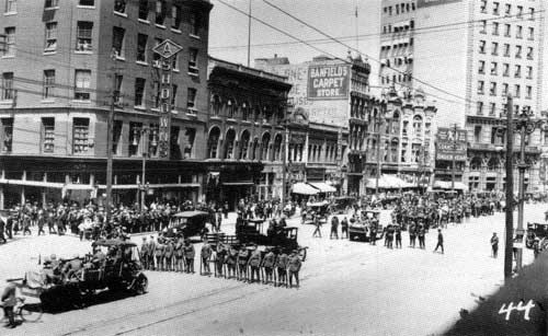 Around midnight on June 16th, the police arrested the Strike leaders. Their houses, along with the Ukrainian Church, the Labour Temple and the Liberty Temple, were all searched for seditious material. Pro-strike veterans, not pleased with this action, organised a silent parade, against the wishes of the Strike Committee, to protest what they saw as an undemocratic act. The authorities made a failed last minute attempt to stop the parade. Thousands of veterans and strikers, along with their wives and children marched on June 21st. They planned to march to the Royal Alexandra Hotel to speak with Senator Robertson about the arrests, but things got out of control.