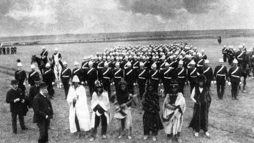 Plains leaders, including Chief Piapot (second from right), with Lieutenant-Governor Edgar Dewdney and the Montreal Artillery, 1885.