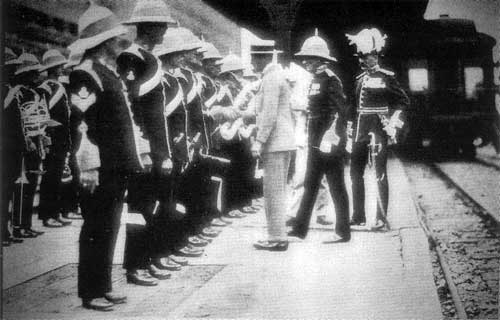 The Prince of Wales inspecting the Princess Pat’s Band at the CPR Station in Winnipeg, 1920.