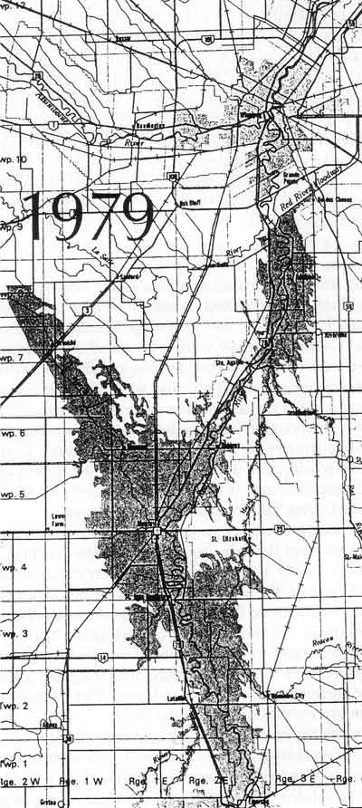 The extent of floodwater in southern Manitoba in 1979.