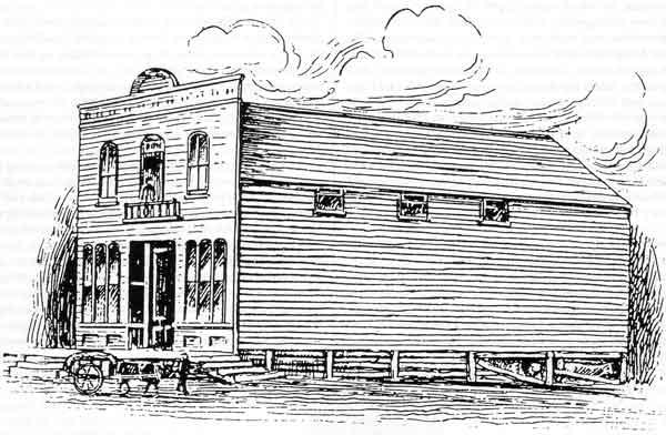 The Second Theatre Royal opened in 1875 on Main Street. A stable occupied an area under the rear portion of the building—a cow can be seen under the structure in this artist’s sketch.
