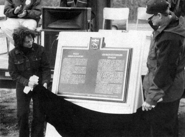 Marcia Rowat and Dr. John Everitt unveil the Manitoba Heritage Council plaque at Inglis in 2002.