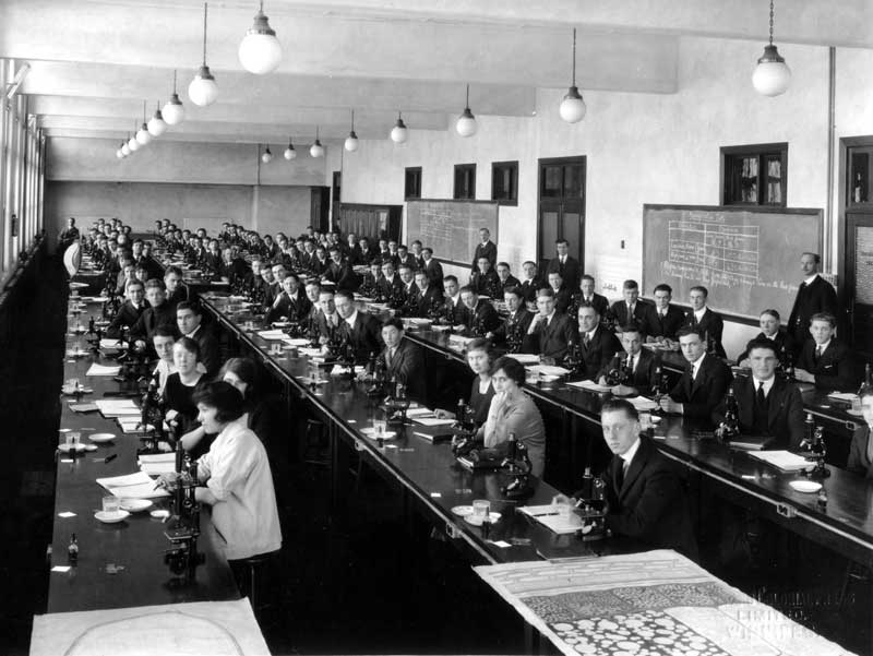 University enrollment exploded with returning First World War soldiers, necessitating the construction of annex buildings at the Broadway site in late 1920. Students in this botany laboratory, probably from the large first-year or second-year courses, examined a specimen on their microscope by adjusting a mirror to reflect light from the room windows through the lenses. Buller is standing at the back of the class, far right, with two unidentified laboratory attendants at left.