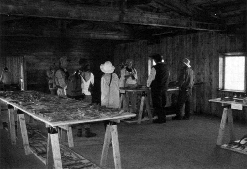 Visitors led by Parks Canada staff on a tour of the Depot. Some of the artifacts found on the site are displayed here.
